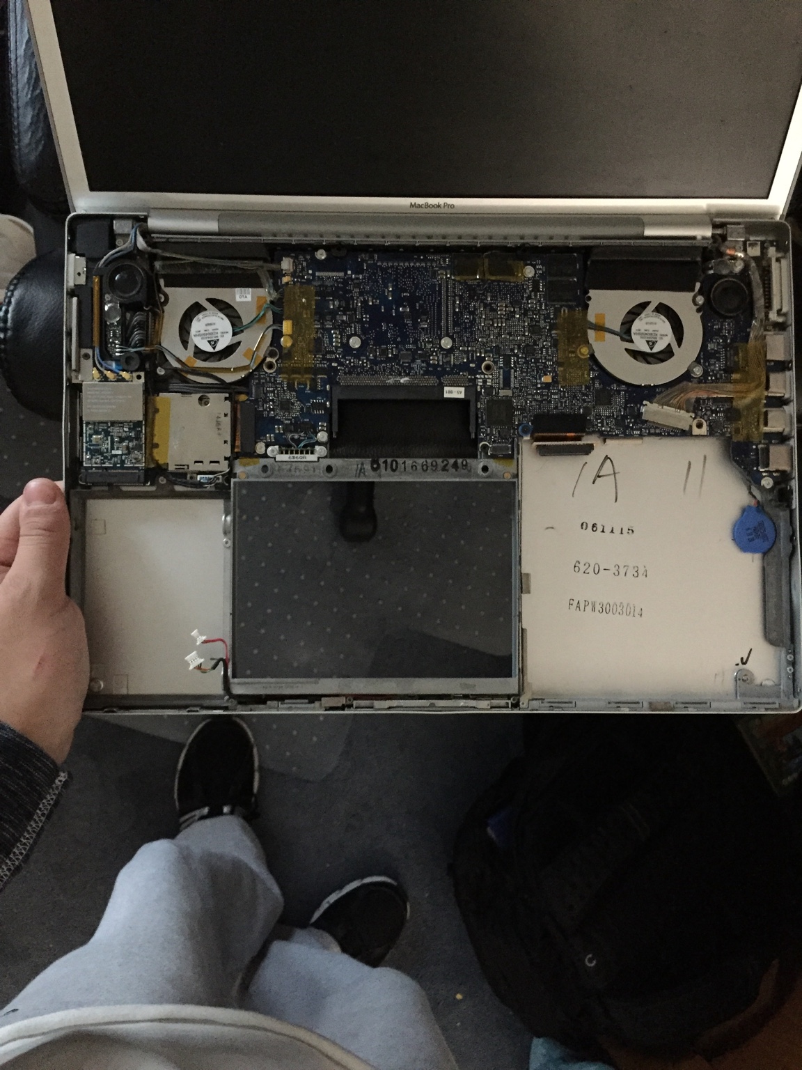 mbp doesn't need work, there things needs. on outside, machine in nice condition few dings in here , there. upon opening lid, looked pretty nice in there well, not exterior work other wiping down. on inside, have find hdd (which have once), odd (which have put in), , hdd interface/ir/status light cable missing too.